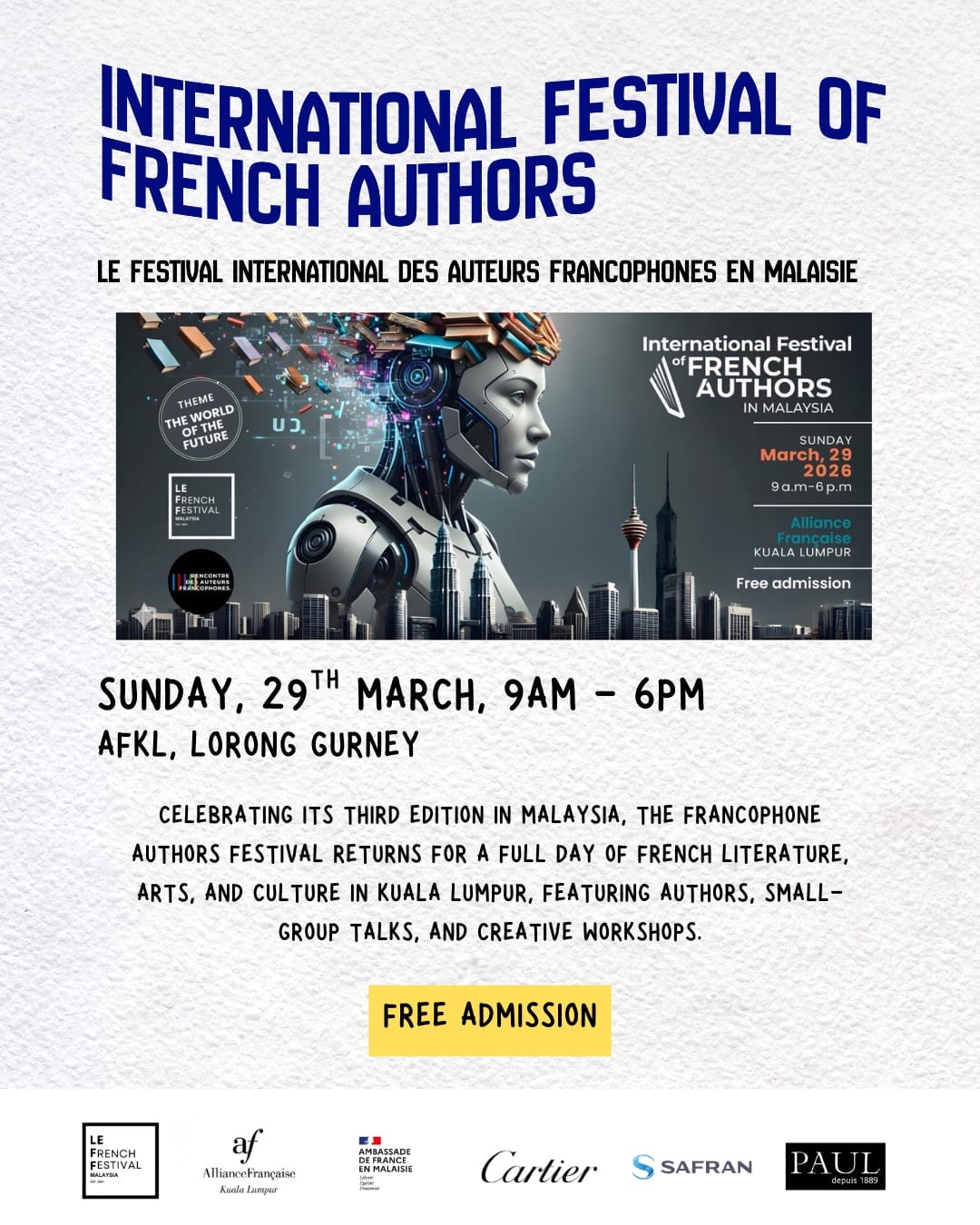 Celebrate Francophonie at the Festival des Auteurs Francophones, the third annual edition in Malaysia, held at AFKL. This event offers a full day dedicated to French literature, arts, and culture. Authors will sell and sign their books, host talks, and engage with visitors, alongside literary salons, creative workshops, partner booths, and on-site catering, bringing the Francophone community together in the heart of KL.
